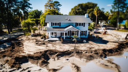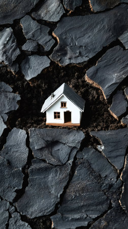 Miniature white house sinking into cracked earth, capturing the devastating impact of earthquakes and the geological consequences of seismic waves on the landscape