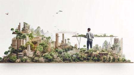 A digital artwork depicting a hand cradling a collage of buildings and greenery, symbolizing urban development and nature.