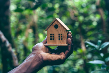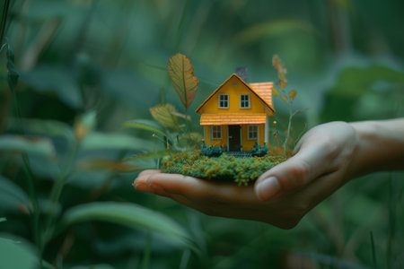 Hand holding tiny home in nature setting, providing ample space for customizable text overlay
