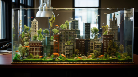 A meticulously designed diorama of a self-sustaining ecosystem within a transparent cube, featuring green plants and water pipes, symbolizing harmony and ecological balance
