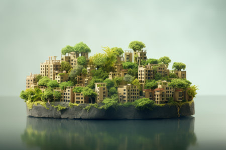 Serene landscape with miniature green houses amid lush foliage for eco friendly themes and designs