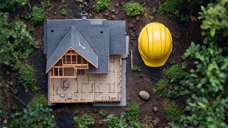 An aerial perspective capturing a model house next to a yellow hard hat, highlighting the connection between nature and construction for design enthusiasts.