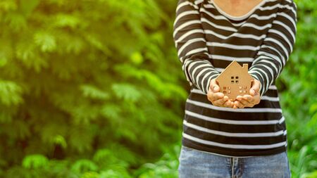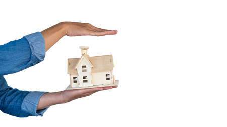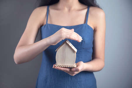 Woman puts her hand on top of a miniature house model, photo of home insurance concept, when buying a new home should have home insurance to be sure if there is any danger to the home.