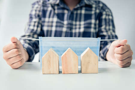 Young asian millennial gen z woman holding white house model and wearing mask for self quarantine or stay at home concept during COVID-19 and coronavirus pandemic