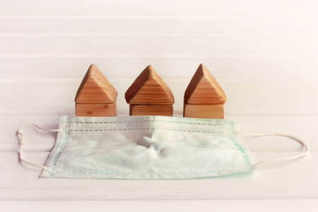 mock-ups of residential buildings covered with a medical mask front view. quarantine activities in the city