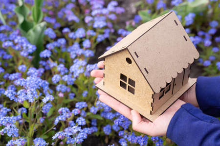 Hands holding a miniature wooden house model over a flower bed outdoors. Moving to a rural area.