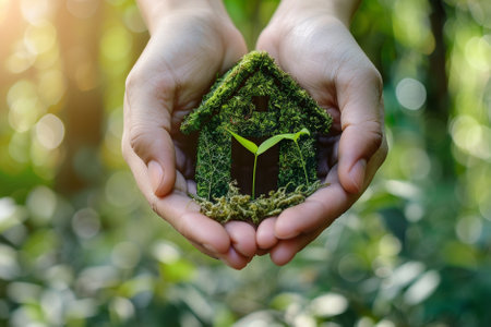 Close-up of human hands gently cradling a tiny eco-friendly home with a lush grass roof, set against a vivid blue backdrop.