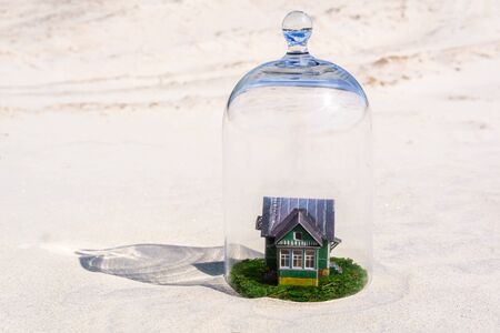 toy cardboard house with green lawn protected by a glass dome cloche among of a lifeless sand desert