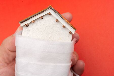 Doctor hands wearing pink gloves uncover plastic wrap from toy white house. Covid-19 concept. Doctor try to save people in the house.