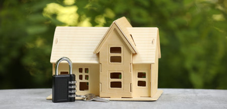 Home security. House model, key and padlock on light gray table outdoors, closeup