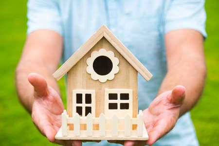 A toy house in the hands of a child. The concept of buying, renting, mortgage housing.