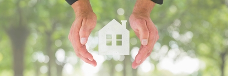 Home insurance protection and property ownership for rent, sale, leasing and safety concept with new house in landloard or real estate realtor, renter or tenant hand.
