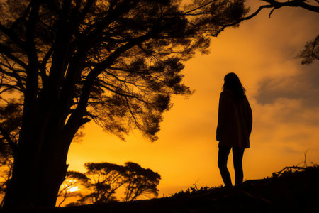 Silhouette of woman blends seamlessly with vibrant city skyline sunset, creating striking double exposure effect. warm colors of sunset contrast beautifully with urban landscape, evoking sense