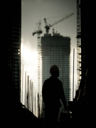 Silhouette of a construction worker walking through site with tall buildings under construction and cranes in the background, showcasing labor and industry.