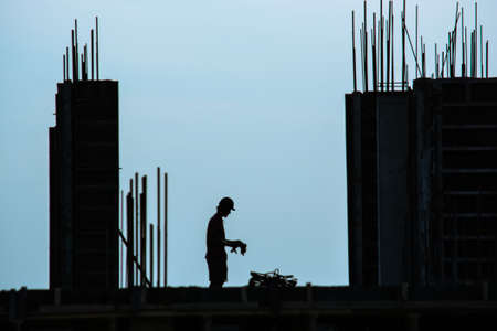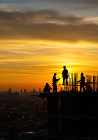 The image showcases silhouettes of construction workers atop a structure with a dusky, colorful sunset as background. The composition employs strong backlighting, creating a dramatic visual impact. The setting appears to be an urban environment during twilight. Suitable for illustrating construction, urban development, or related commercial applications.