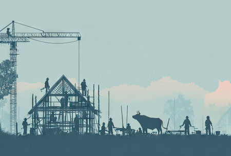 A silhouette image presents construction workers at a house site, operating a crane. The scene shows the structure's framework, with tools and a bull. The composition features a minimalistic style in shades of blue and gray. It's suitable for various commercial uses, illustrating development and industry.