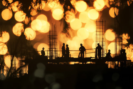 Construction workers collaborated on a site at sunset, demonstrating teamwork and effort in the building industry on Labor Day.