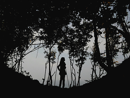 Man walking in the forest at sunrise. Travel and adventure concept.