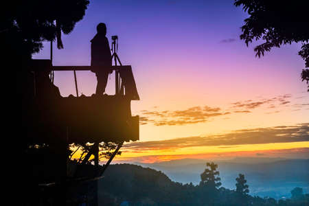 Silhouette picture of people on mountain peak rock at morning sunrise background. Landscape nature