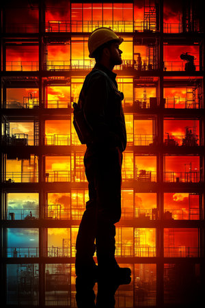 This captivating image captures construction workers silhouetted against a fiery backdrop during twilight, highlighting the energy and drama of urban development.
