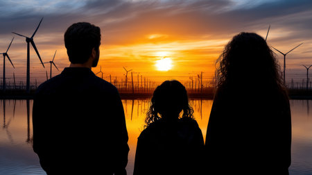 Happy family looking at solar panels. Solar farm and sunlight at sunset. Solar energy for green energy. Sustainable renewable energy. Photovoltaic power plant or solar park. Energy sustainability