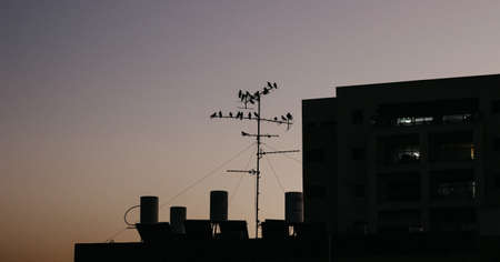 A silhouette of birds sitting on a dish on the roof at sunset with buildings in the distance