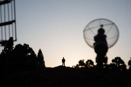 Creative artwork decoration. Silhouette of a man standing near giant air defense radar antenna during sunset. Satellite dishes or radio antennas against evening sky. Selective focus