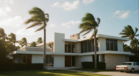 Modern villa in tropical garden on sunny day, created using generative ai technology. Architecture and design concept digitally generated image.