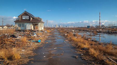 An abandoned residential area showcasing ruins and nature reclaiming the land. This image captures the stark contrast between destruction and the surrounding beauty.