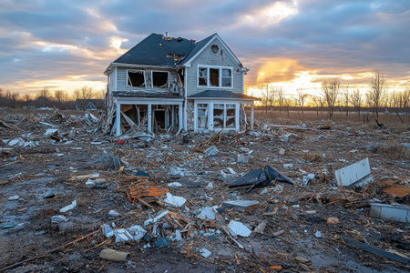 house destroyed by tornado at sunset near the sea illustration generative ai art