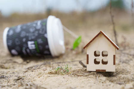 Ecology concept. There is a small wooden house on the grass, next to it there is a plastic glass - rubbish.