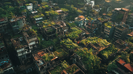 Dilapidated urban landscape with crumbling buildings and overgrown vegetation in foreground. Concept Urban Decay, Abandoned Buildings, Overgrown Vegetation, Dilapidated Landscapes
