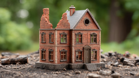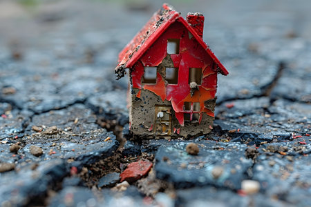 Miniature house sinking into cracked earth after earthquake, highlighting the devastating effects of natural disasters on homes and properties