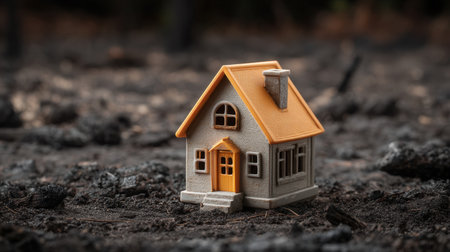 Miniature house model placed on cracked and dry ground, representing earthquake damage and the impact of natural disasters on properties and infrastructure