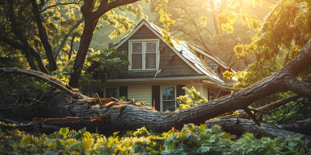 Close-up of a house roof crushed by a fallen tree after strong winds, ideal for themes like insurance, emergency repair, or climate damage.