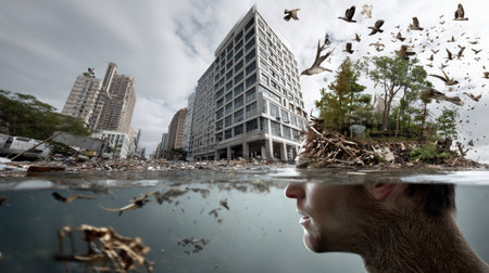 This image captures a surreal blend of nature and urban decay, symbolizing the conflict between environmental destruction and the innate human connection to nature.