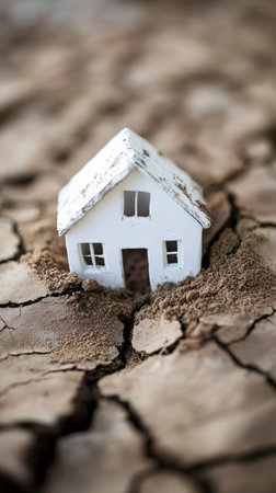 Miniature white house sinking into cracked, dry earth, illustrating the devastating effects of earthquakes and highlighting the risks of geological instability and property damage