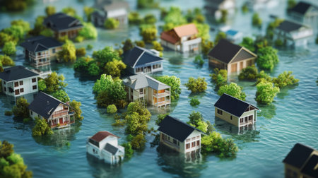 A graphic representation of rising sea levels flooding coastal areas, with submerged homes and buildings illustrating the consequences of climate change.