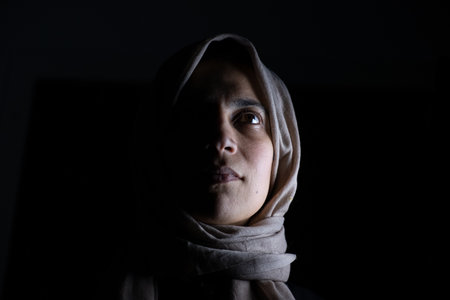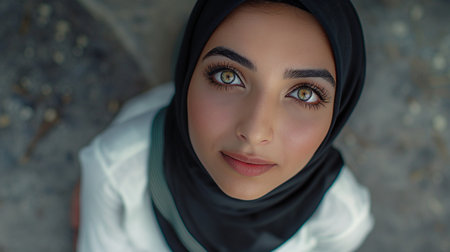 Woman gazes gently at the camera wearing a dark headscarf. Her expression is serene, with soft lighting enhancing her features. Subtle makeup highlights her natural beauty