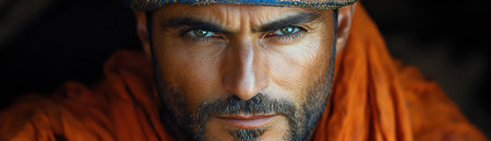 Serious man in traditional attire, dark background, focused lighting, closeup