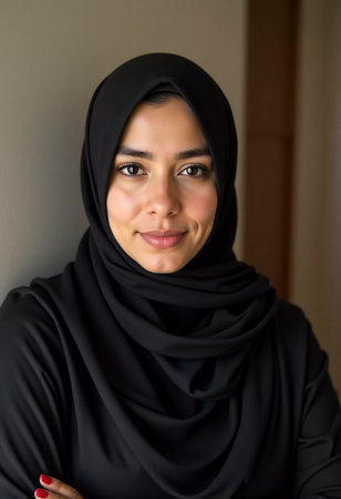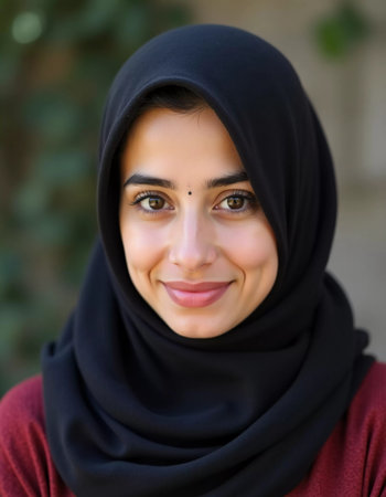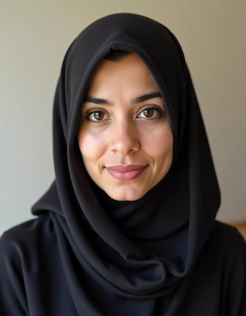 A young woman wearing a black hijab looks directly at the camera