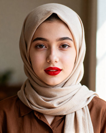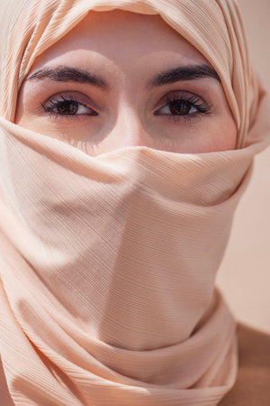 Close up portrait of beautiful Muslim woman with hijab looking at camera