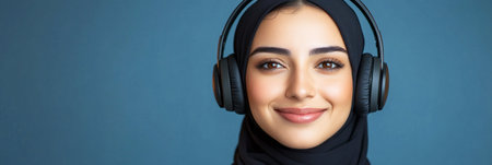 A relaxed and stylish Arab girl, smiling with white headphones on, poses against a deep blue background in a clean, minimalistic mock-up design, banner