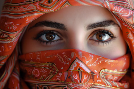 Beautiful young middle eastern woman with brown eyes is gazing at the viewer from behind her red veil