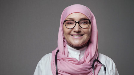 Young Muslim lady doctor in stylish glasses and pink hijab smiles widely looking into camera on background of grey wall in well-lit studio closeup.