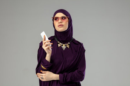 Using cellphone. Beautiful arab woman posing in stylish hijab on studio background with copyspace for ad. Fashion, beauty, style concept. Female model with trendy make up, manicure and accessories.
