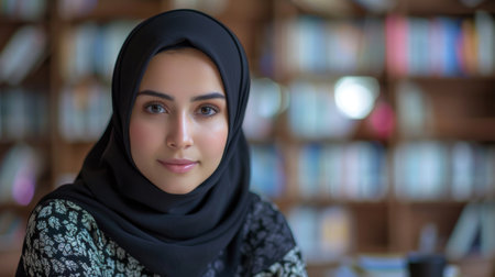 Young Muslim woman student in hijab holding books in a university college library. Islamic education concept for women. Generative ai.