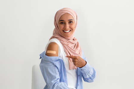 Vaccinated Happy Muslim Woman In Hijab Pointing At Adhesive Bandage On Arm