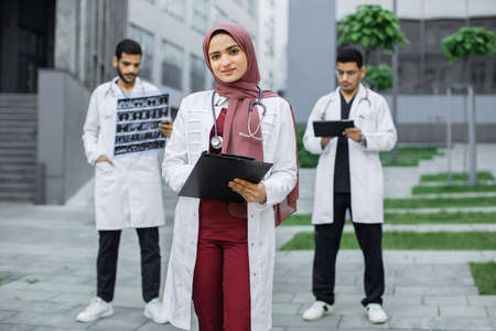 Female Muslim pleasant doctor in hijab, standing with clipboard outdoors in front of hospital building, while two handsome Arabian men doctors working with x-ray and tablet pc behind