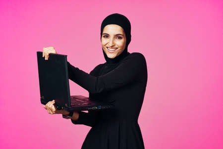 cheerful muslim woman with laptop education student internet technology